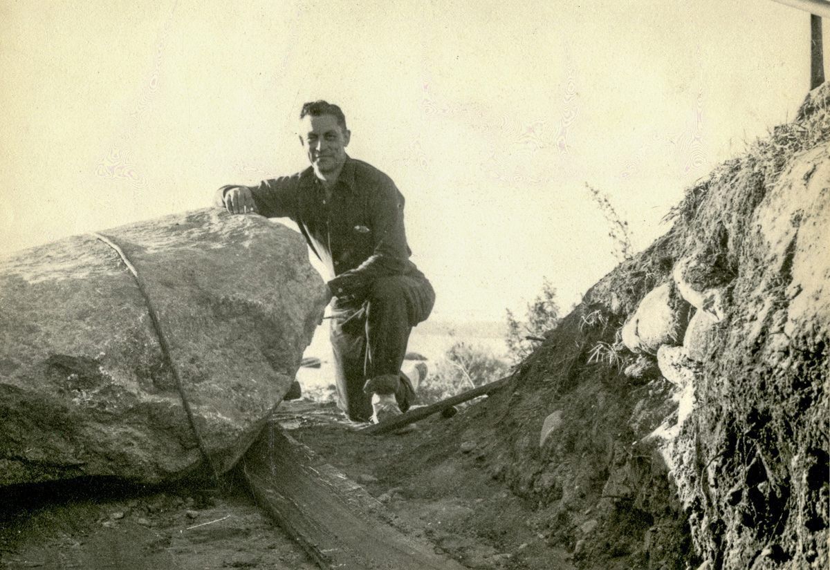 A man kneeling next to a boulder that has a rope tied around it and a board underneath it in order to move it to another location on Wee Captain Island.Collection