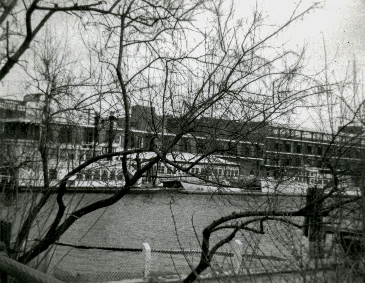 A view from across Greenwich Harbor of the Showboat Motor Inn with the 'Showboat' and other boats moored in front of it.Collection
