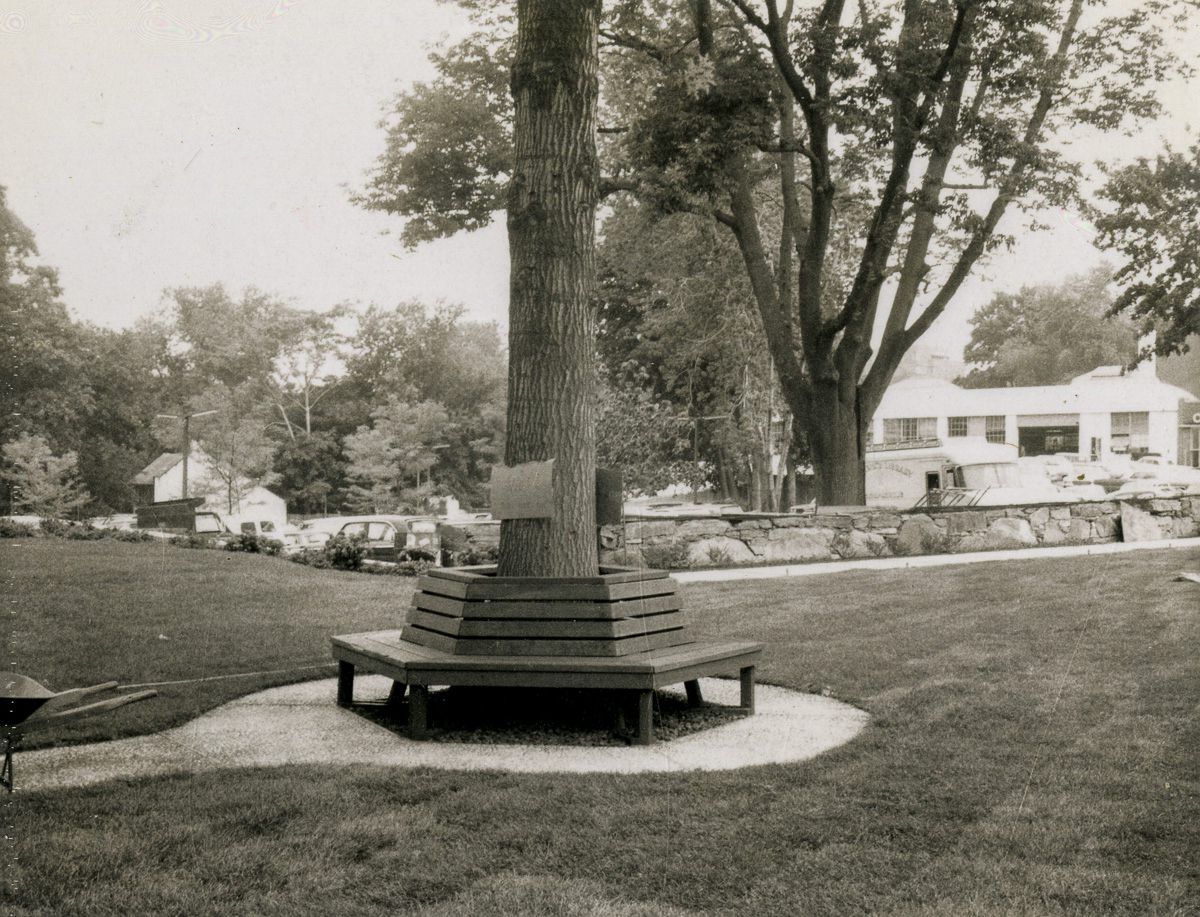 A wraparound tree bench on the grounds of the Greenwich Library on Greenwich Avenue.