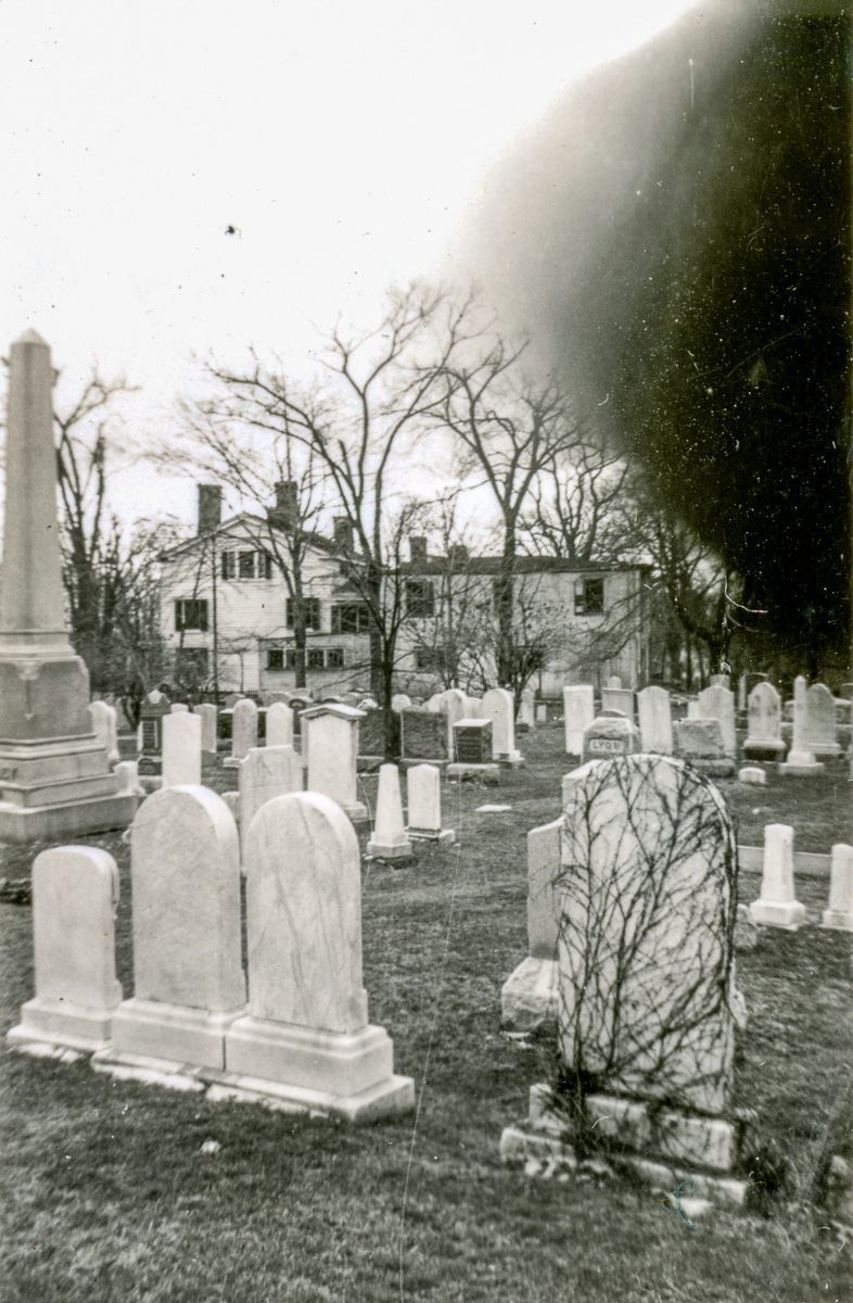 A view of The Elms inn from the Second Congregational Church's cemetery, facing West.