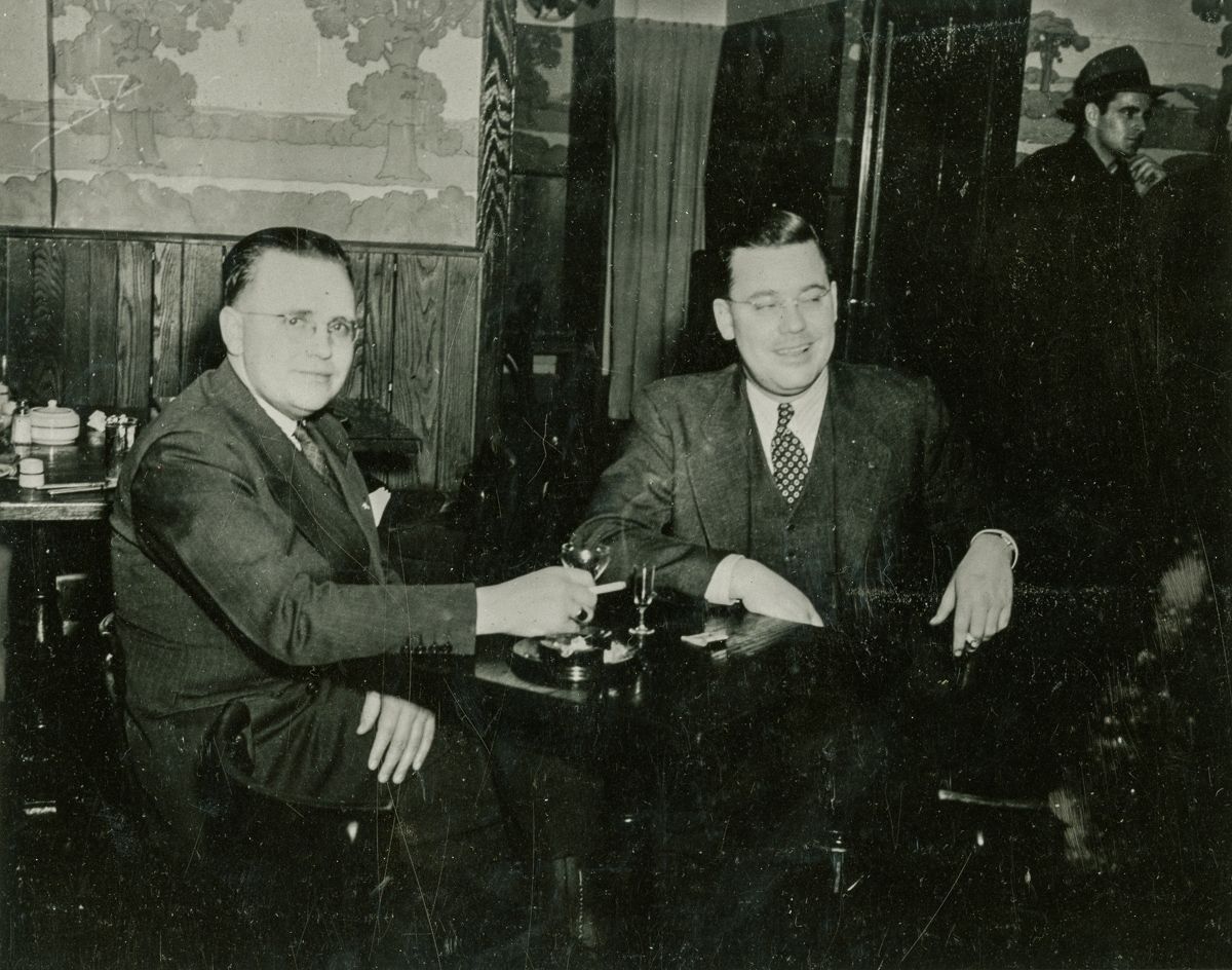 Two men, left Charles W. Jensen and right, Arthur P. Jensen, having drinks at the Pickwick Inn. The Pickwick Inn was opened in 1917 and was owned by Russel A. Cowles, who later opened the Pickwick Arms hotel a short distance away.Collection