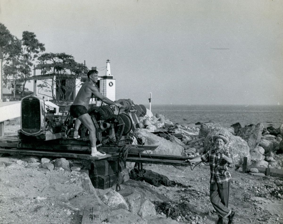 A man operating machinery, likely a boat winch attached to what appears to be a car engine.Collection