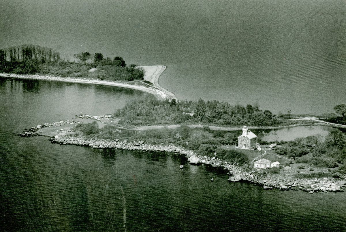 An aerial view of Great Captain Island with both the 1868 granite lighthouse and the 1970 skeletal tower lighthouse visible in the foreground of the image.Collection
