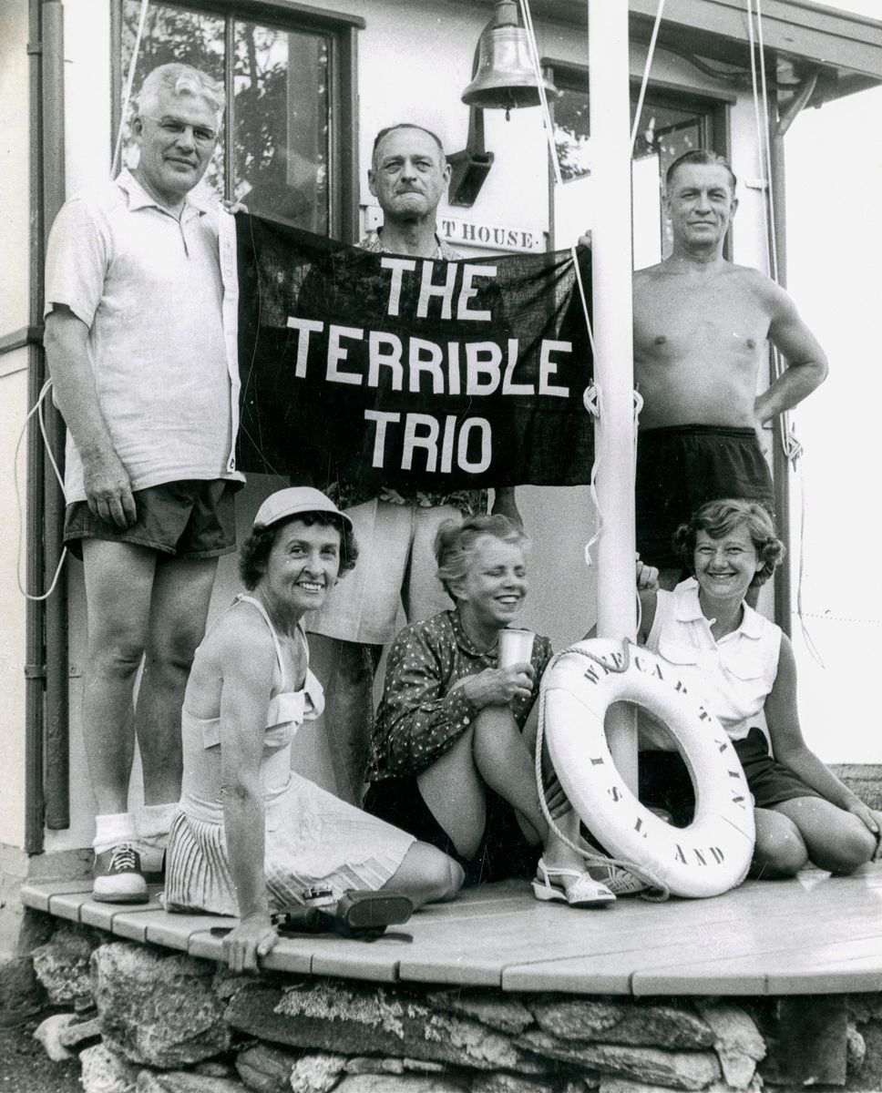 Three men and their wives posing with a flag that names them 'The Terrible Trio.'