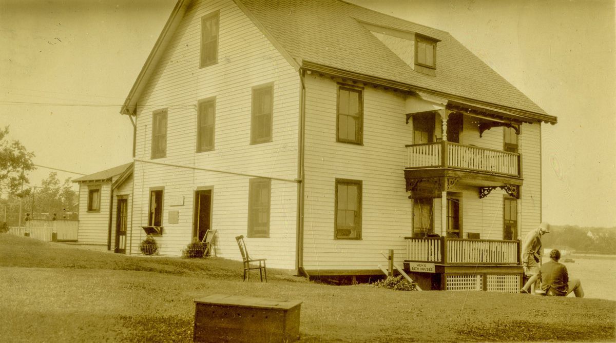 People sitting outside the Shore Island Beach and Yacht Club's bathhouse.