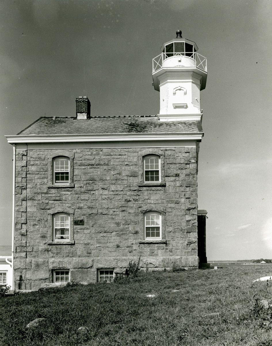 A side-profile of the Great Captain Island's lighthouse, facing north-east. The Great Captain Island's current lighthouse was built in 1868, replacing an earlier 1829 structure, and was in use until 1970 when it was replaced by a skeletal tower lighthouse built next to it. The structure is made from granite with a cast iron lantern tower; the structure was placed on the National Register of Historic Places in 1991 and was majorly refurbished in the early 2000's.Collection