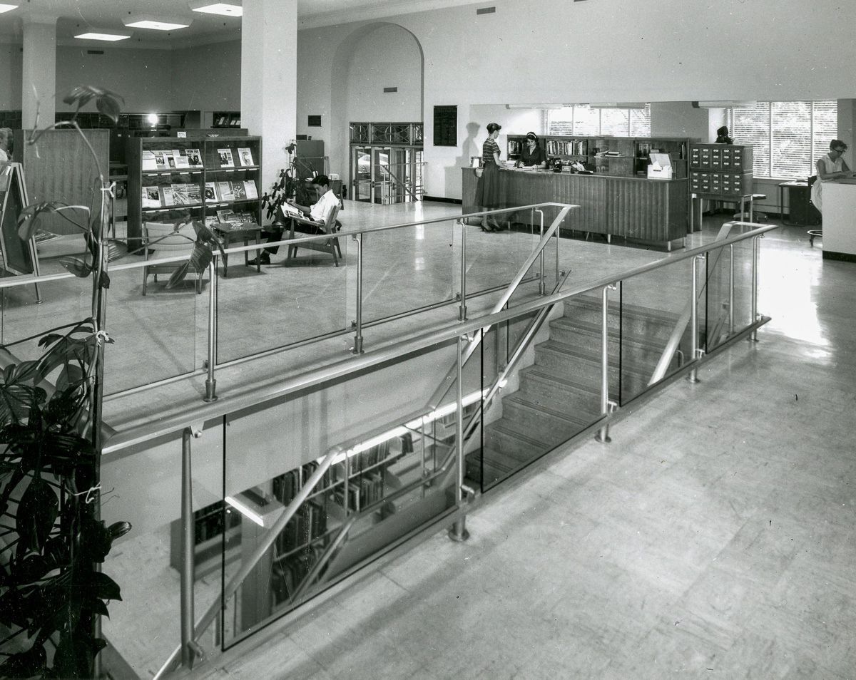 A view of the main desk of the Greenwich Library; stairs to the lower level can be seen in the foreground of the image.Collection