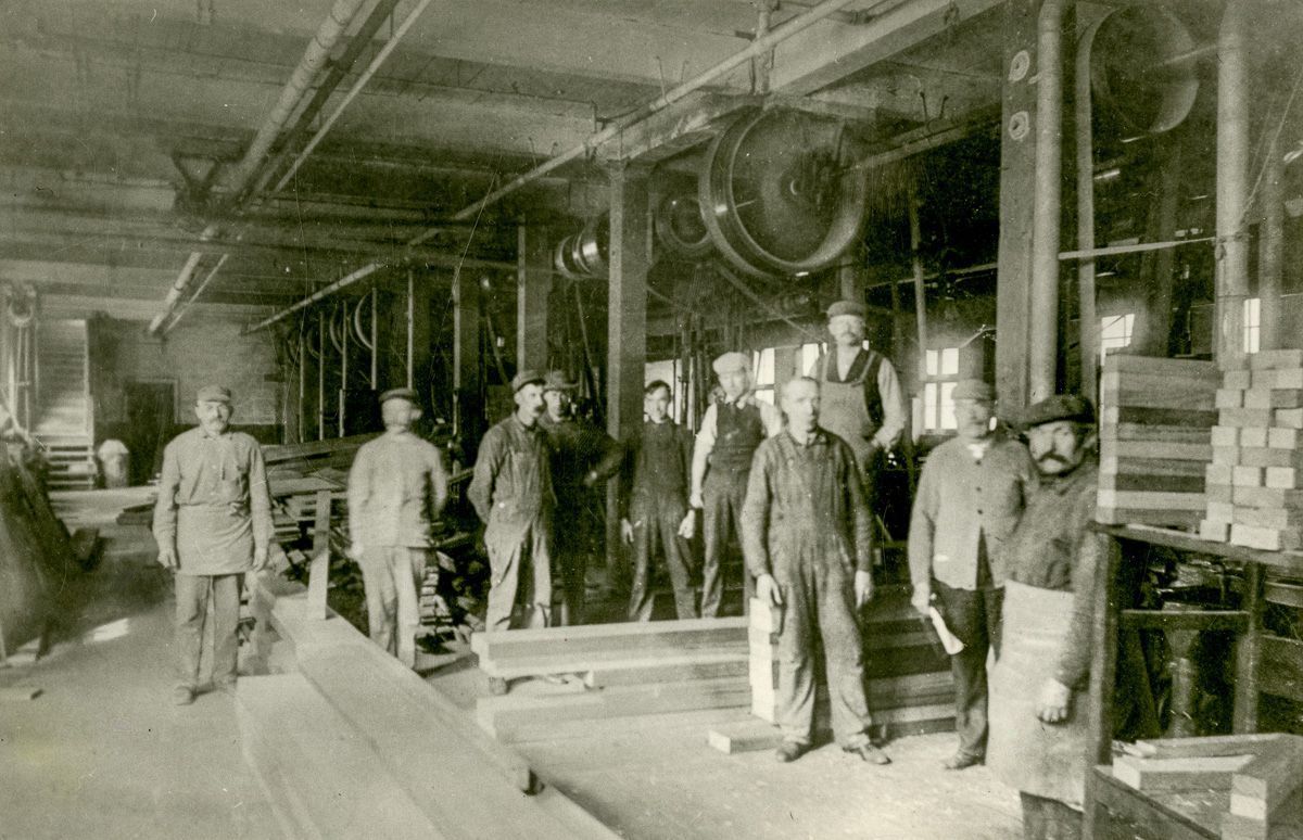 Workers of the Mertz Lumber Mill posing by in the interior of the mill.