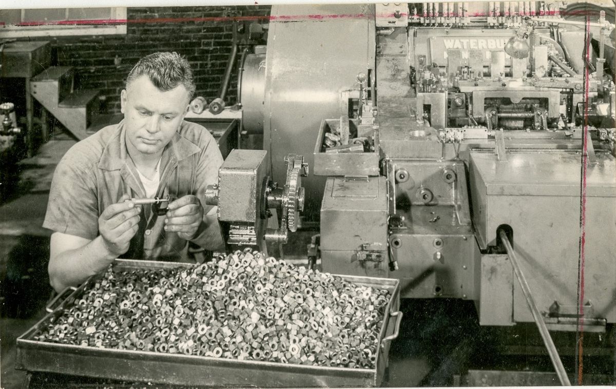 A man checking a nut from a tray of newly made nuts from nut-bolt making machine.