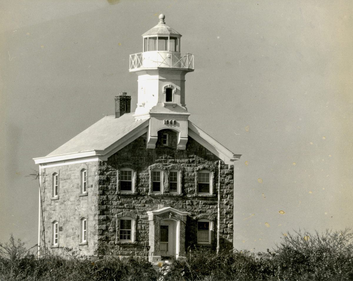 A view of the Great Captain Island's lighthouse front face, facing north-east. The Great Captain Island's current lighthouse was built in 1868, replacing an earlier 1829 structure, and was in use until 1970 when it was replaced by a skeletal tower lighthouse built next to it. The structure is made from granite with a cast iron lantern tower; the structure was placed on the National Register of Historic Places in 1991 and was majorly refurbished in the early 2000's.Collection