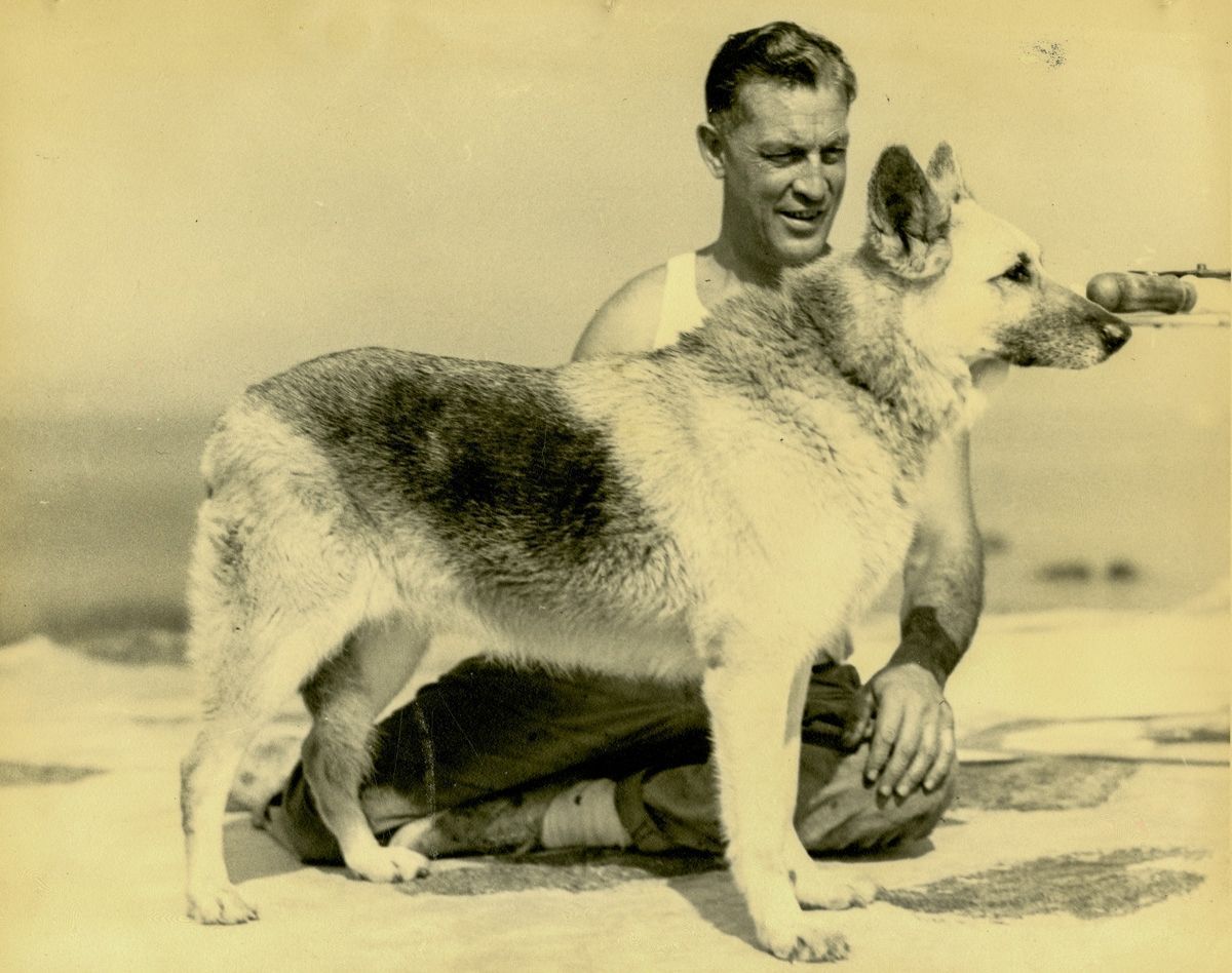 A man posing with his dog on Wee Captain Island.