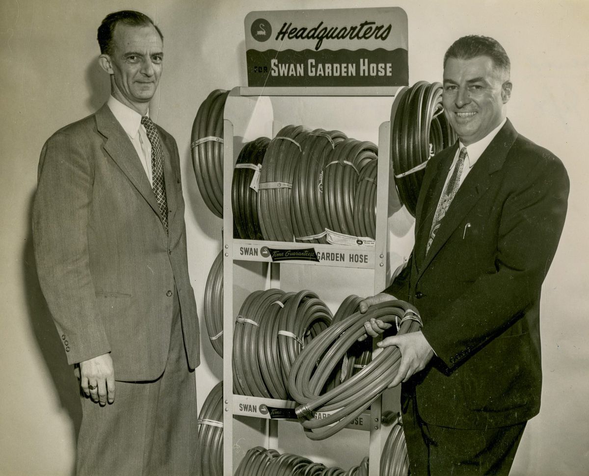 Two men (left, Albrecht, right, Heyel) posing in front of a display of Swan Garden Hose hose's.Collection