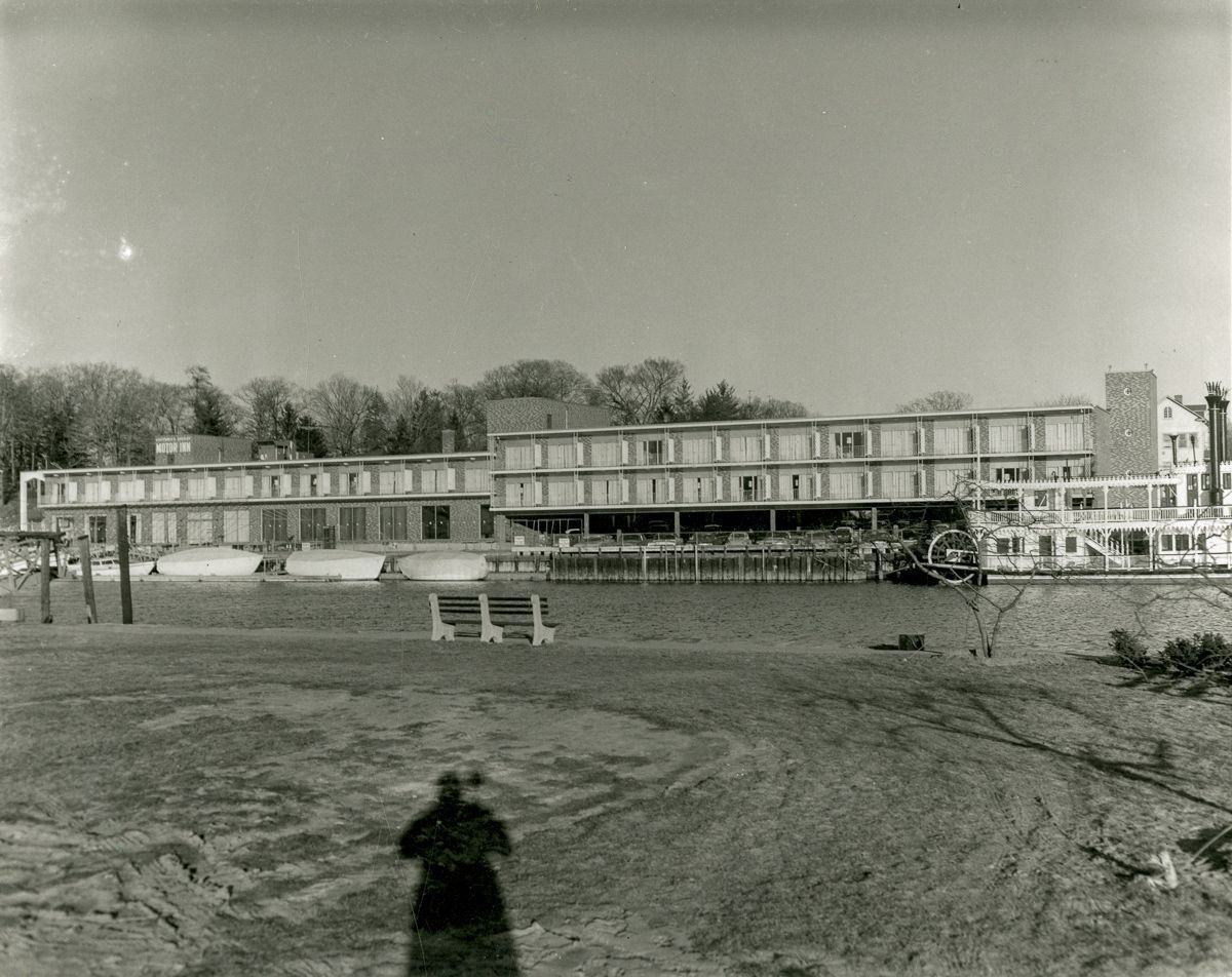 A view of the 'Showboat' moored in front of the Showboat Motor Inn.