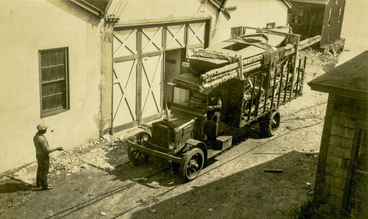 A truck belonging to the New England Boat Works with boat hulls and spars in its bed.Collection