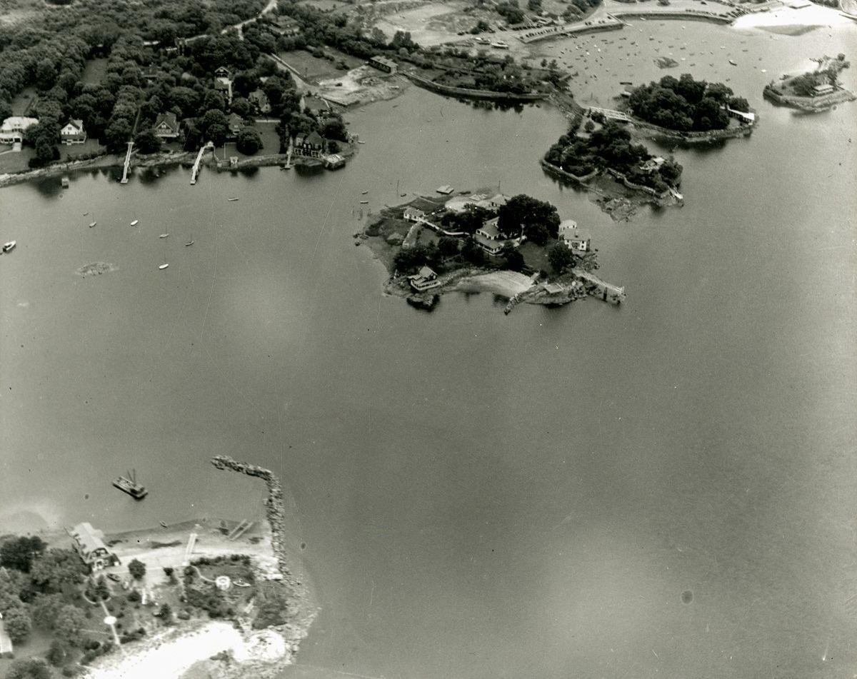 An aerial view of Shell Island, Shore Island, and Game Cock Island, facing north.