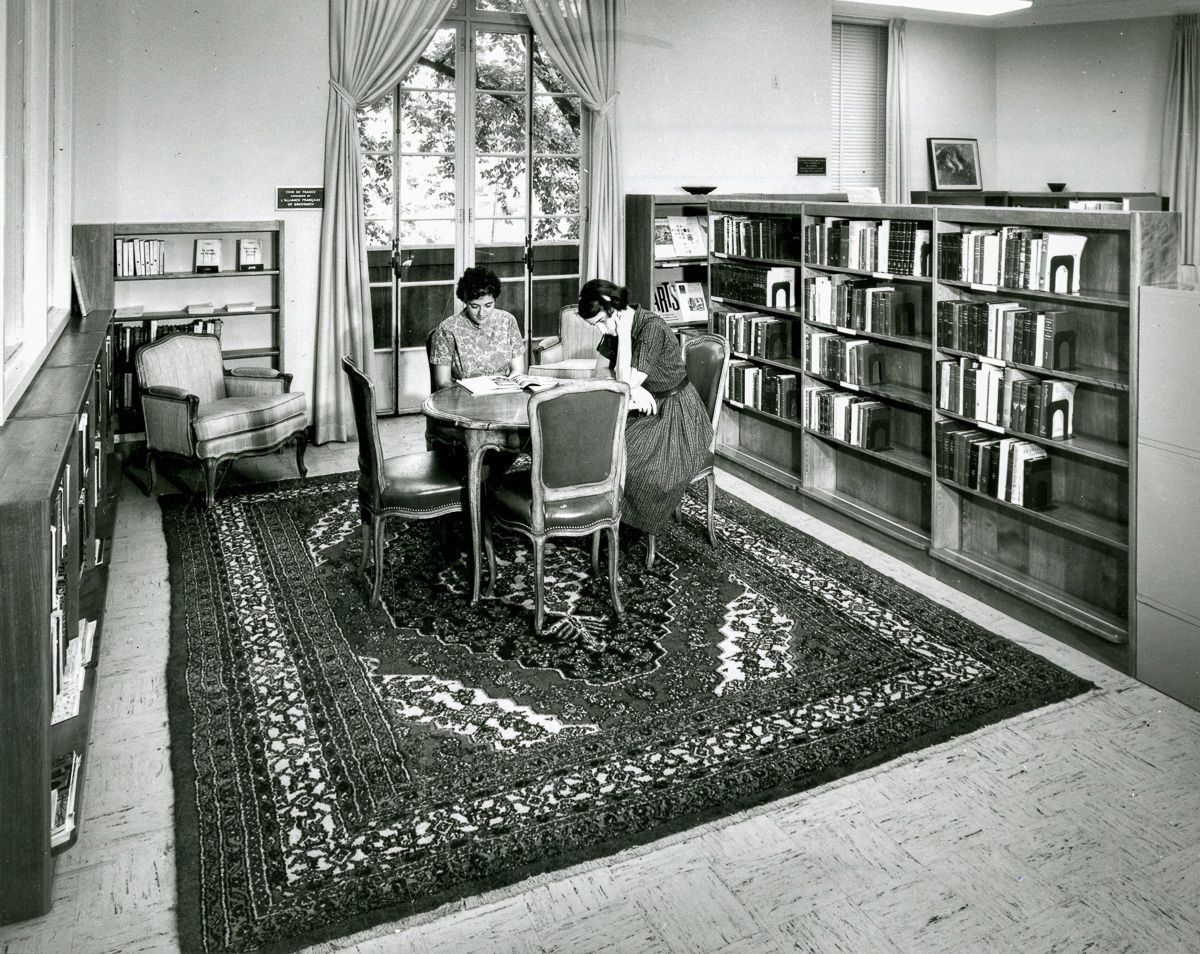 Two young women reading in Greenwich Library's 'French Corner' of their Fine Arts Department.Collection