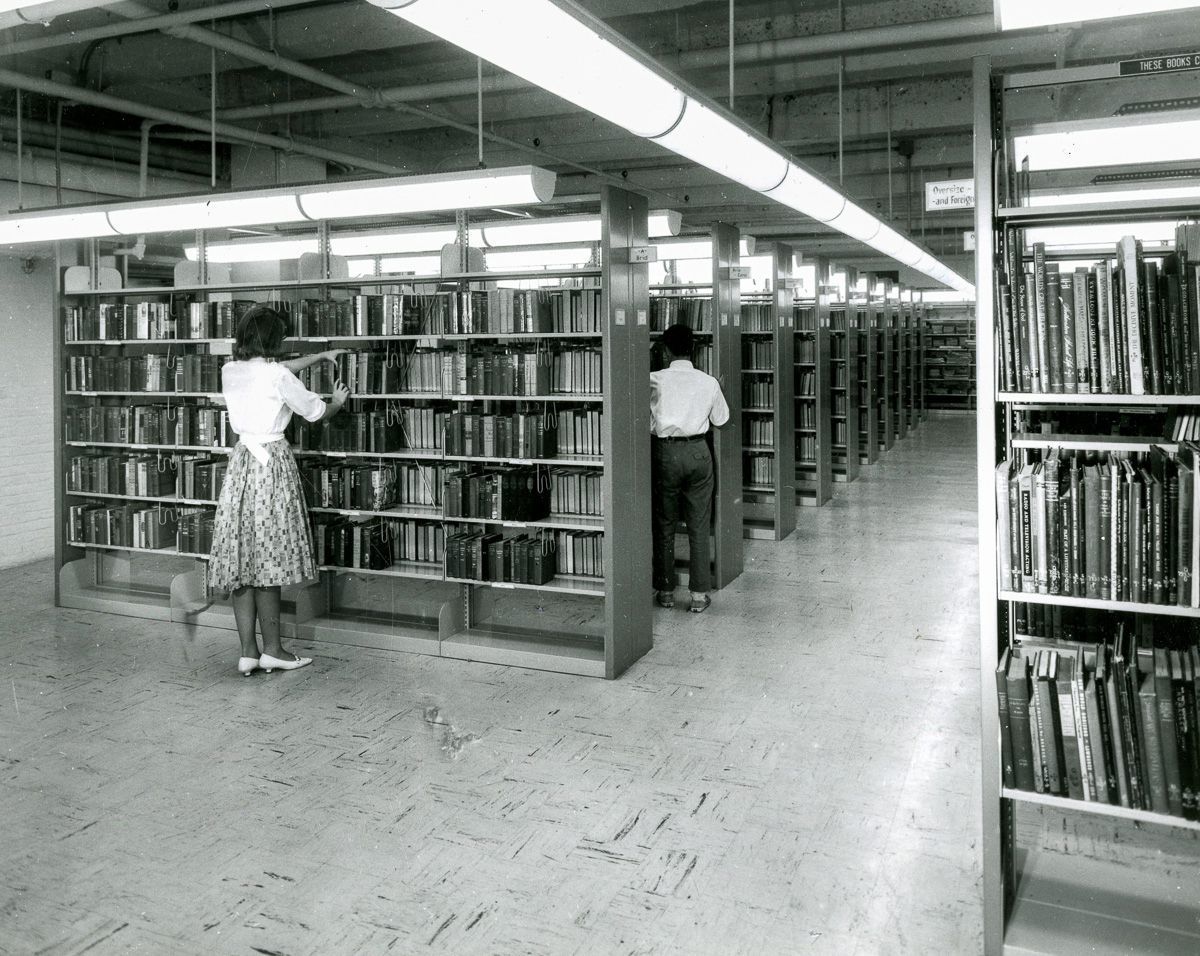 People looking through the stacks in the Greenwich Library's lower level shelving.