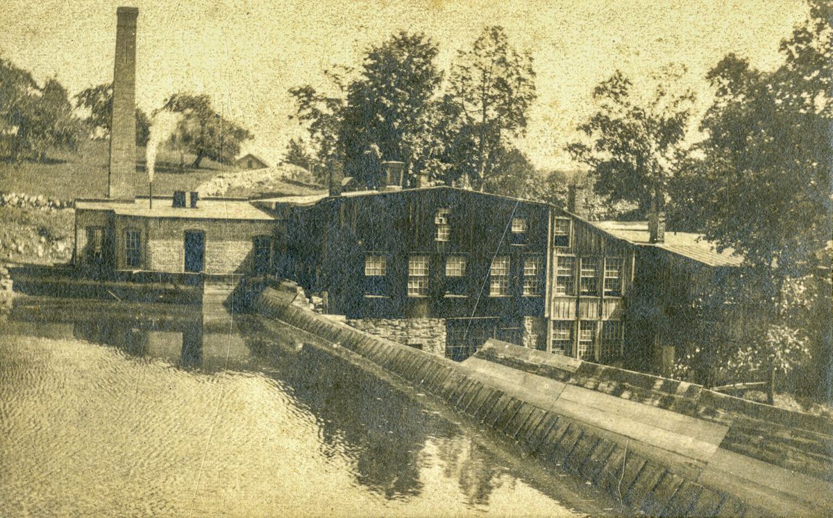 A view of the Wilcox Mill, built by Josiah Wilcox (b. 1804 - d. 1883) in 1828 on the Byram River. The Mill produced tinning tools, carriage parts, and according to a likely apocryphal story cannon shot and gun-carriage parts during the Civil War.Collection