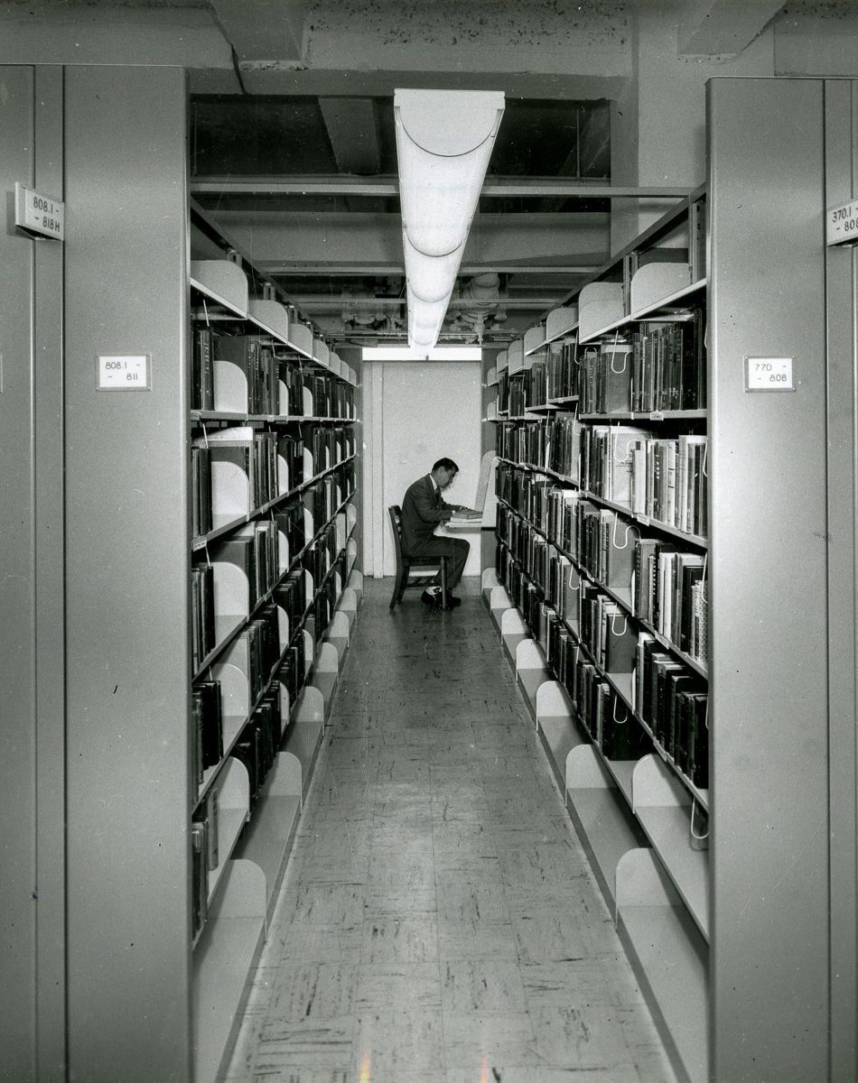 A man sitting at a reading desk at the end of the lower level stacks of Greenwich Library.Collection