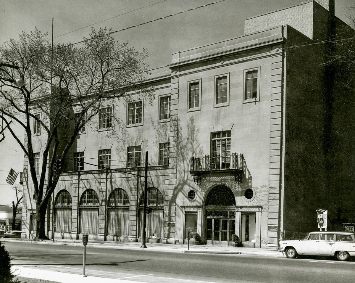 A view of the original entrance to the Greenwich Library from across West Putnam Avenue; the portion of the building visible in this photo was the Franklin Simon department store that was acquired by the Library in 1960.Collection