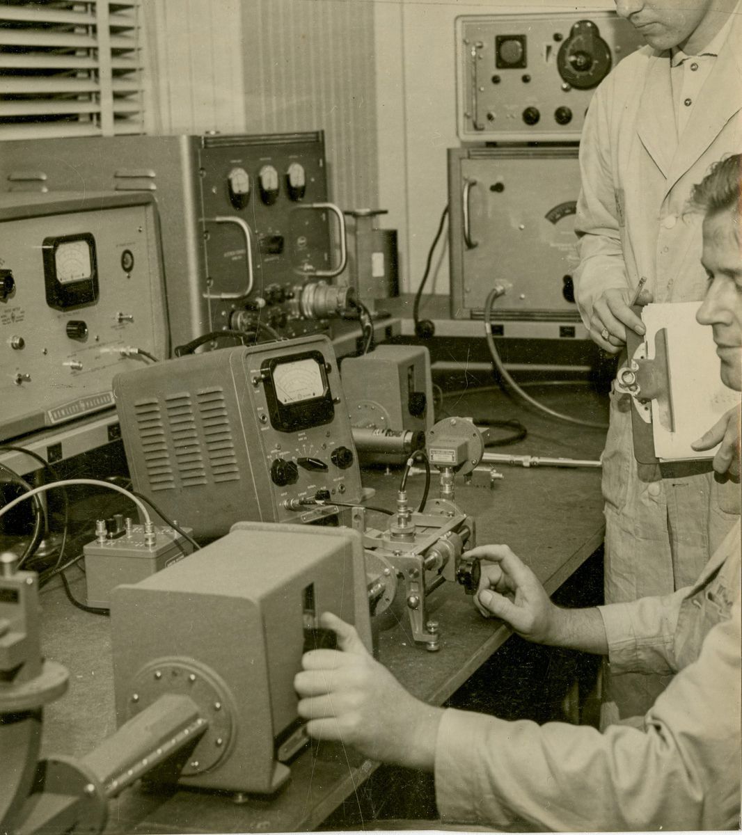 Two men, one with a clipboard and the other adjusting dials, in front of a machine.