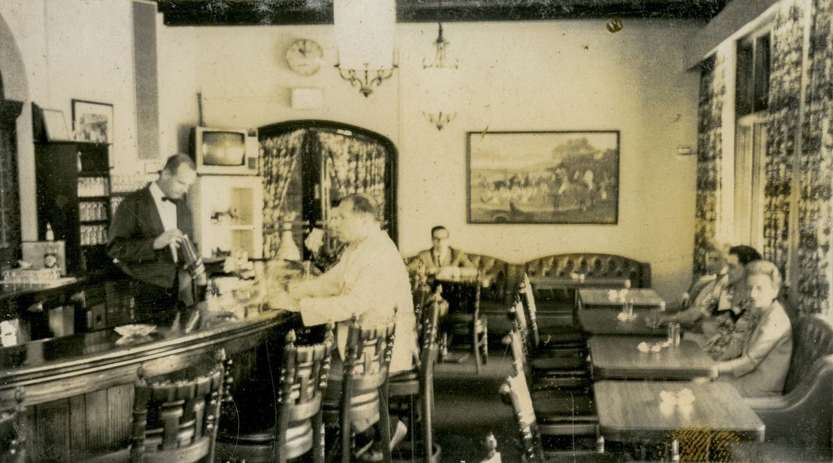 People sitting in the cocktail lounge of the Pickwick Arms hotel.