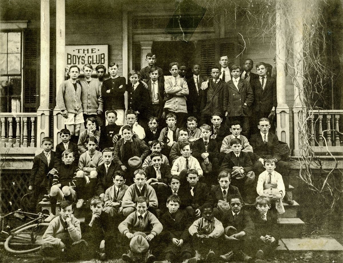 Members of Greenwich Boy's Club posing on the front steps of the Club's building.