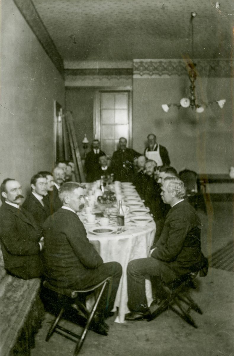 Members of the Masonic Order having supper in the Isaac L. Mead building at the corner of Greenwich Avenue and the Post Road; Amos Avery is on the left of the image, the balding man with a large mustache.Collection