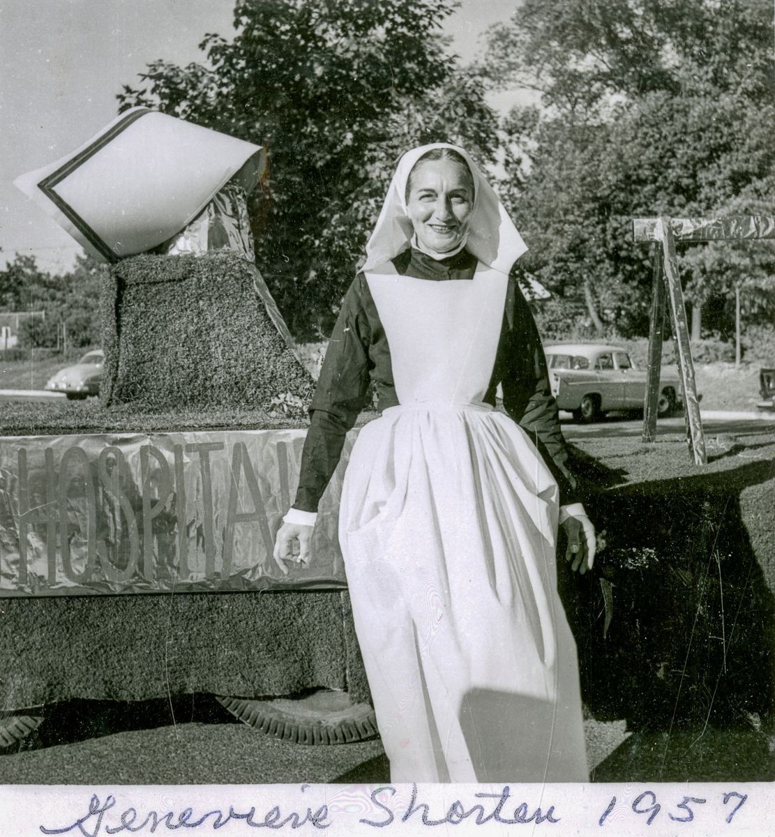 Genevieve Shorten, a Greenwich Hospital nurse, posing in front of an award-winning Nurses Alumnae float that took part in the Founder's Day Parade, 1957.Collection