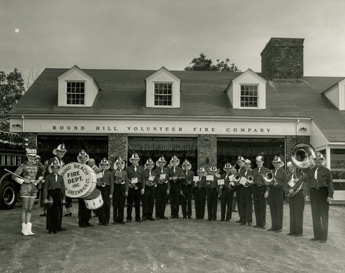 Members of the Round Hill Volunteer Fire Company's marching band (with a Sound Beach Fire Department bass drum) in front of their firehouse.Collection