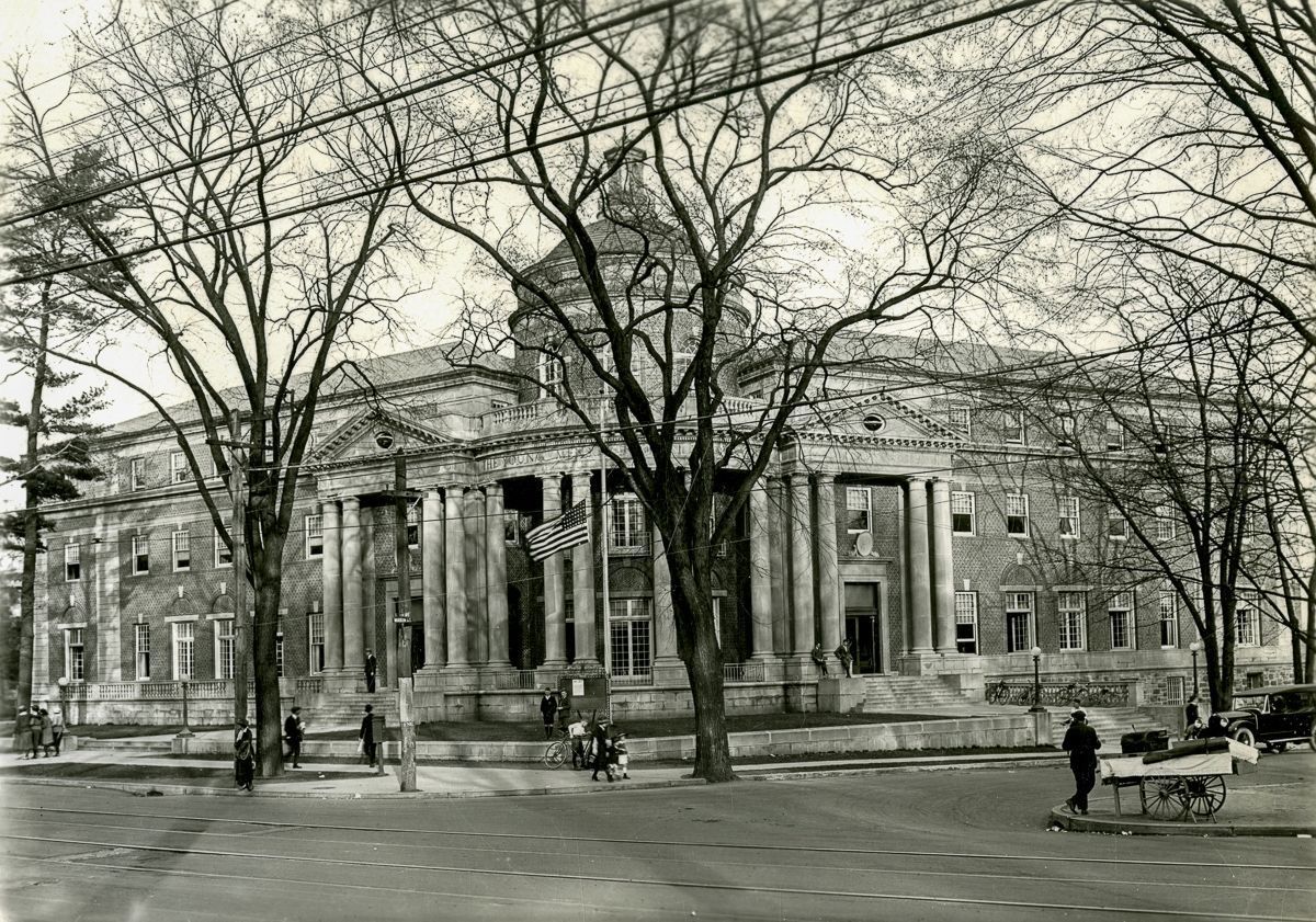 A view of the newly built YMCA building, dedicated on November 11th 1916, with 'Pete the Peanut Man' visible with his cart on the bottom right of the image.Collection