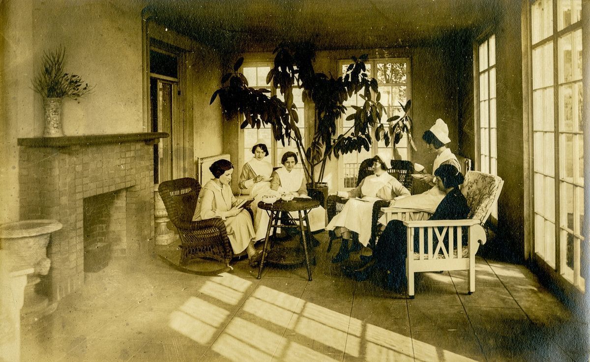 Nurses enrolled in the Greenwich Hospital School of Nursing sitting together having tea in a sunny room.