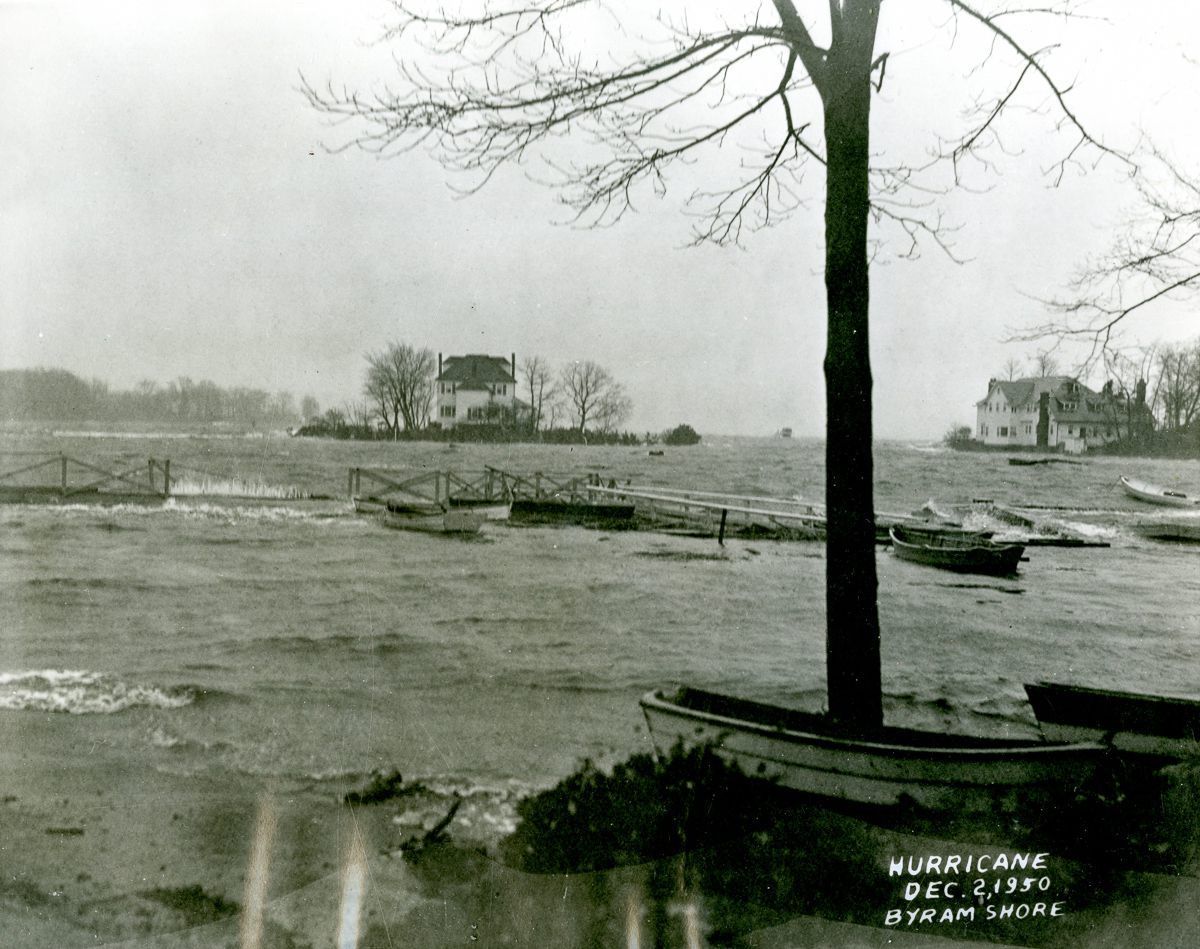 A view from a flooded Byram Park of Rich Island and Farwells Island in Byram Harbor after the "Great Appalachian Storm of 1950" hit the area.Collection