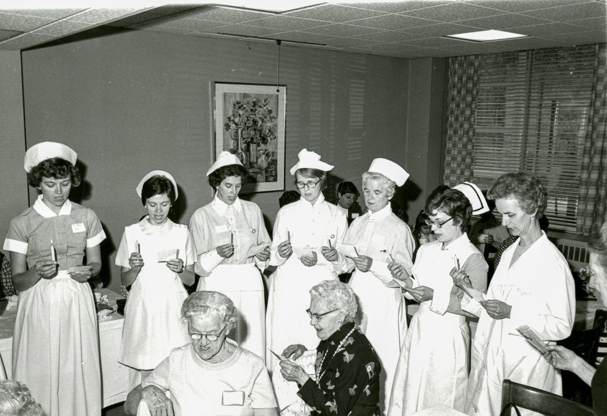 A group of nurses, members of the Greenwich Hospital School of Nursing Alumnae Association, some in period uniforms, repeat the nursing pledge.Collection