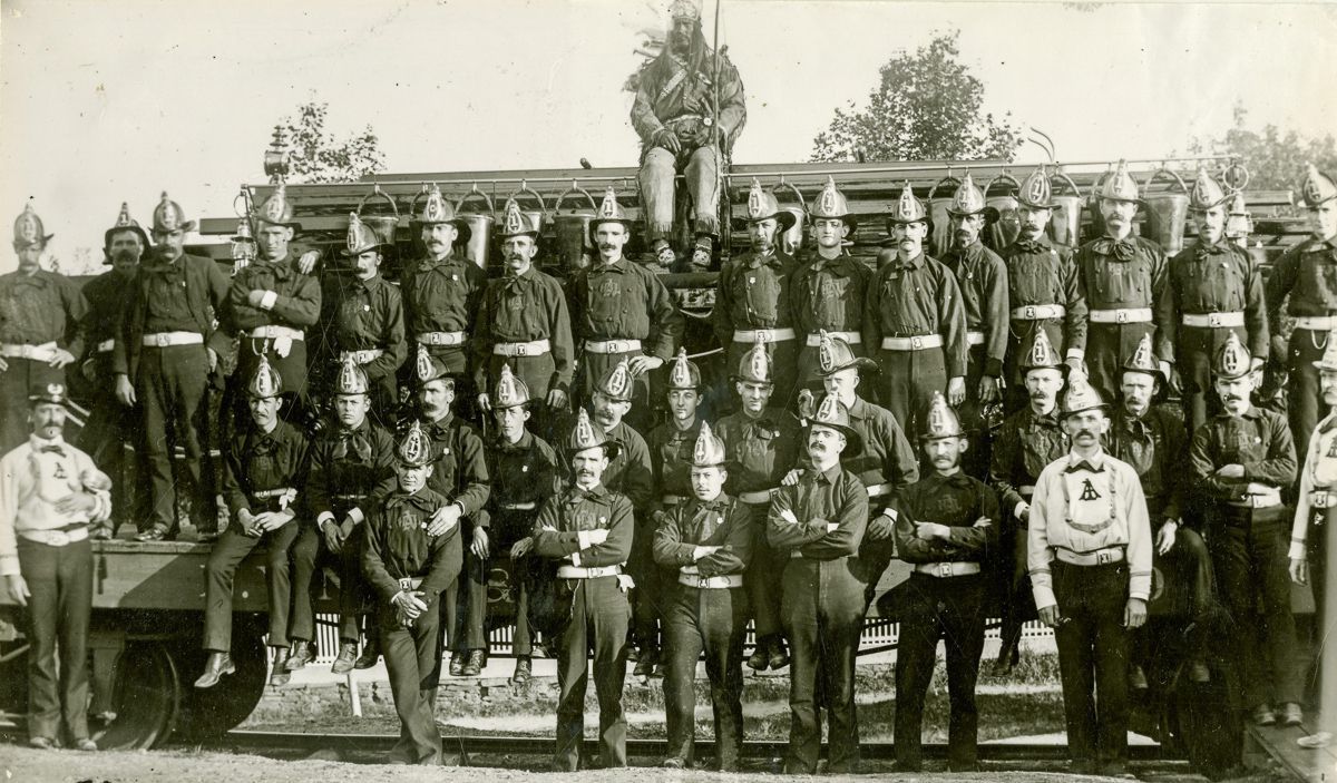 Amogerone fire company with one member dressed up as 'Chief Amogerone' posing with fire equipment (the first hook and ladder the company owned) on their way back from a firemen's gathering out of town.Collection