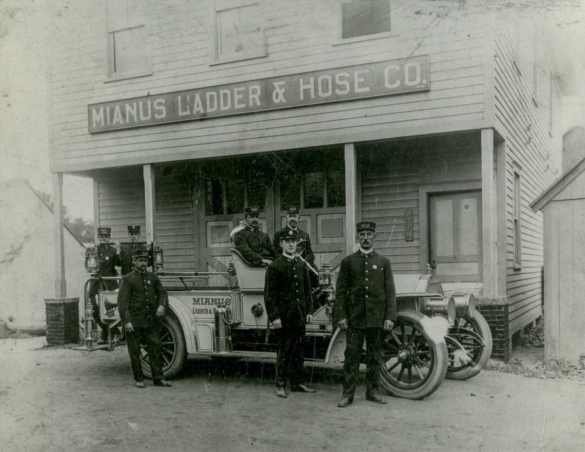 Mianus Fire Company's Ladder and Hose vehicle with fire fighters standing around it; the vehicle was built at Mianus Boat Works.Collection
