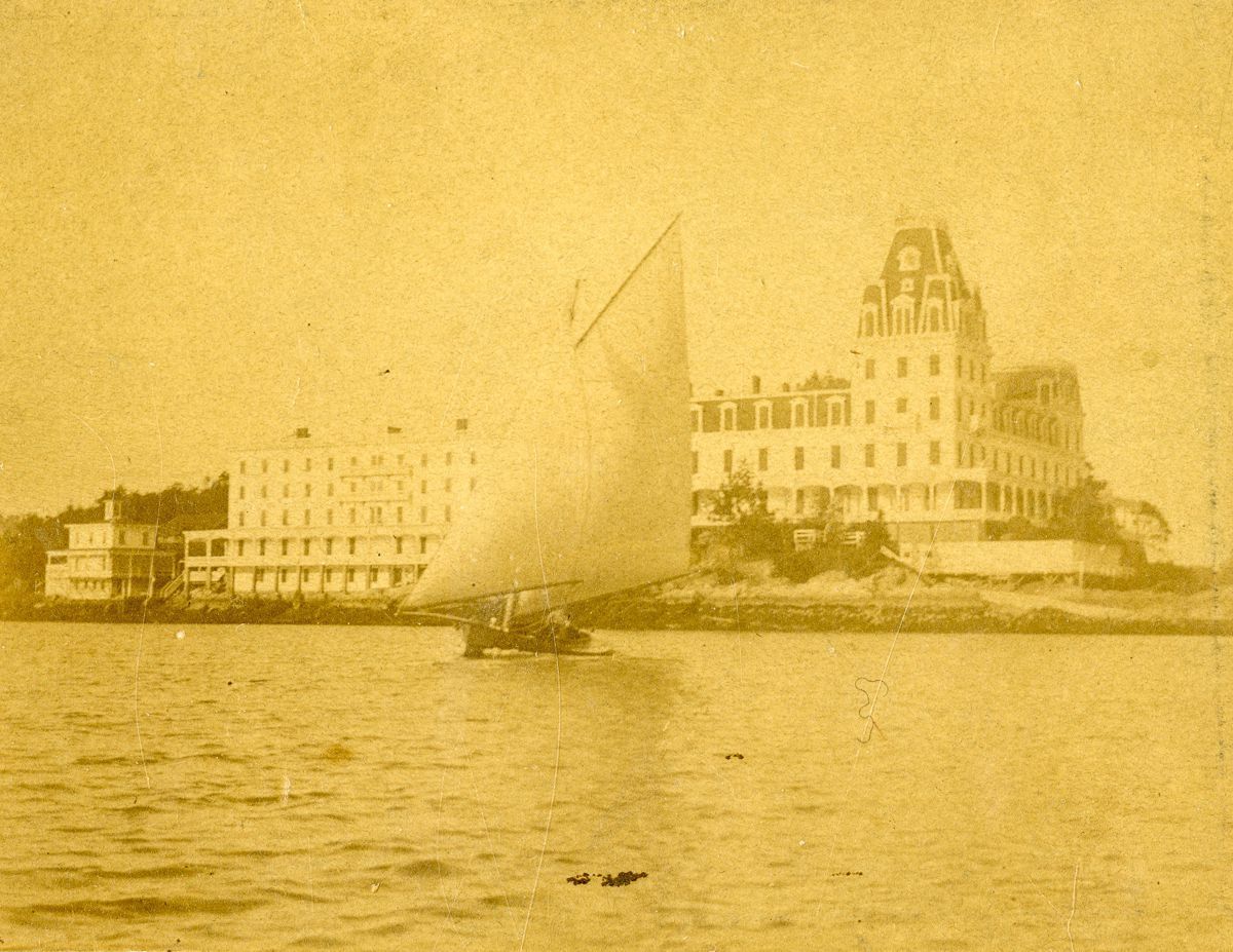 A sailboat, likely the 'Sirene,' a sloop owned by the First Commodore of the Indian Harbor Yacht Club, Henry Doremus, in front of the Indian Harbor Hotel.Collection