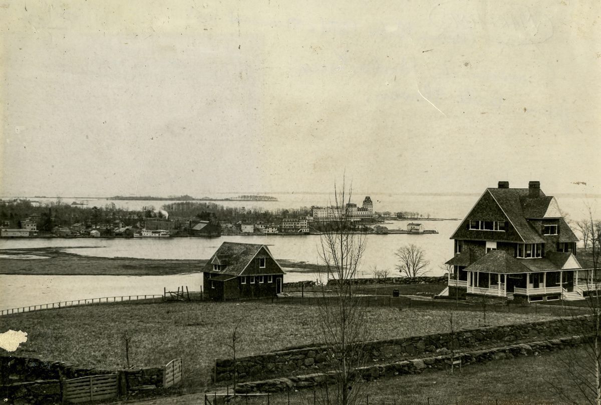 A view from Belle Haven., looking east across Greenwich Harbor, Steamboat Road, and Smith Cove towards the Indian Harbor Hotel.Collection