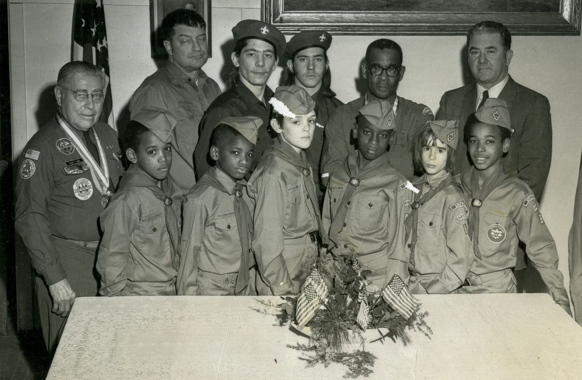 Boy Scouts and older members of the Boy Scouts of America posing in front of a table.