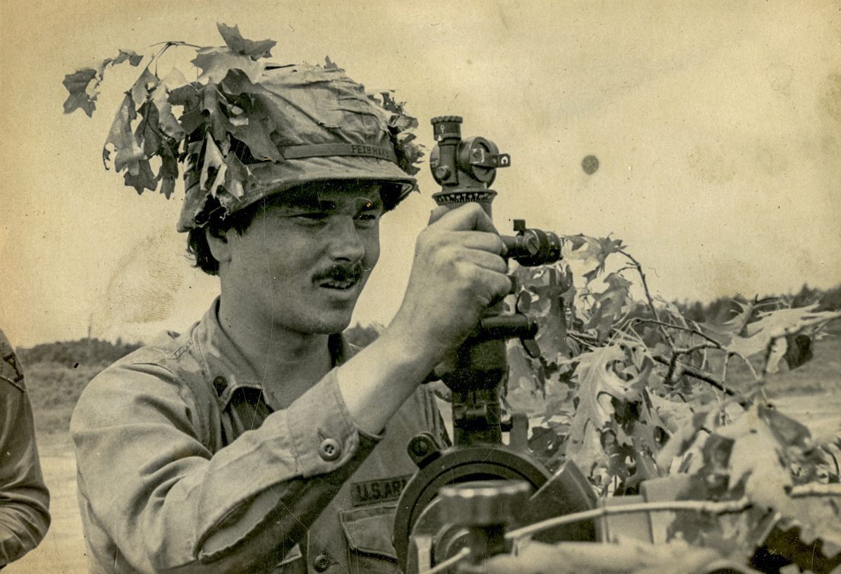 A soldier with camouflage on his helmet using surveying equipment.Collection