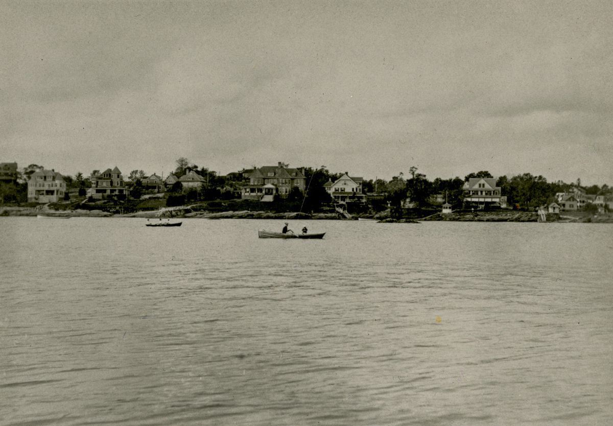A view of Byram Shore from the water with people in rowboats in the foreground.