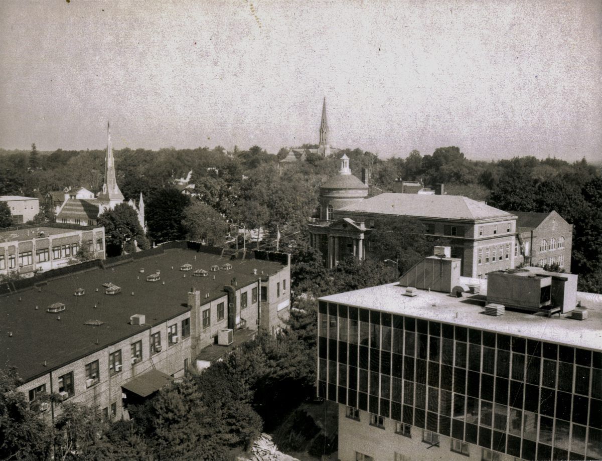 An elevated view of the YMCA building from the roof of 1 Pickwick Plaza.