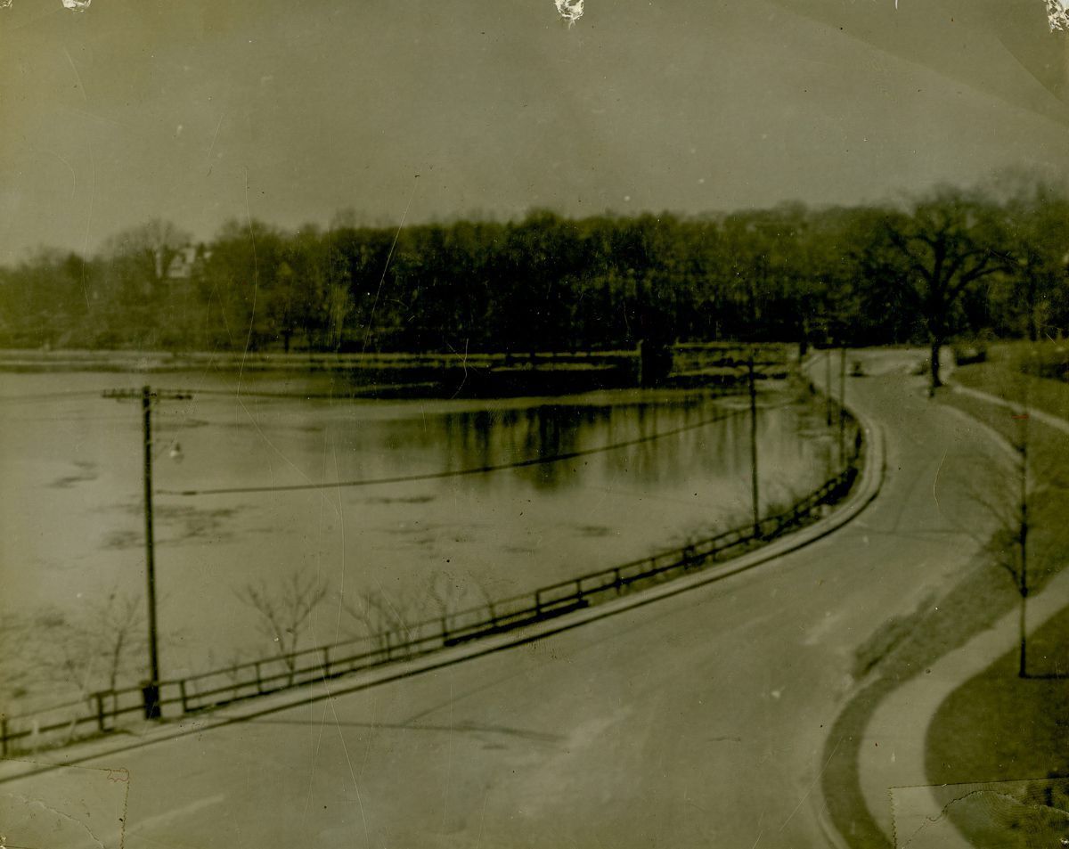 Horseneck Lane in the foreground and Shore Road and Bridge in the background, all surrounding the upper end of Greenwich Harbor.Collection