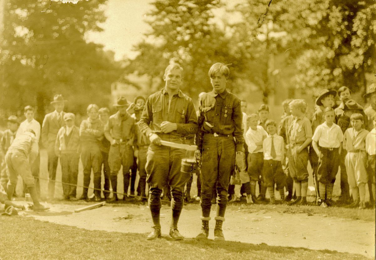 Boy Scouts at an event, one is holding a small pot on a stick with the other holding a hatchet.Collection