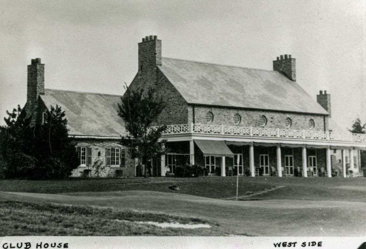 The west side of hate Round Hill Club's Clubhouse with its covered patio with tables and chairs, viewed from its golf course.Collection