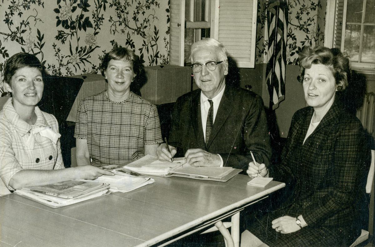 Auxiliary Officers of the Nathaniel Witherell hospital and nursing home at a meeting. From Left to right: Mrs. Bertram B. Fisher, Mrs. Michael Eagan, Allen Whitman, and Mrs. William L. Walsh.Collection