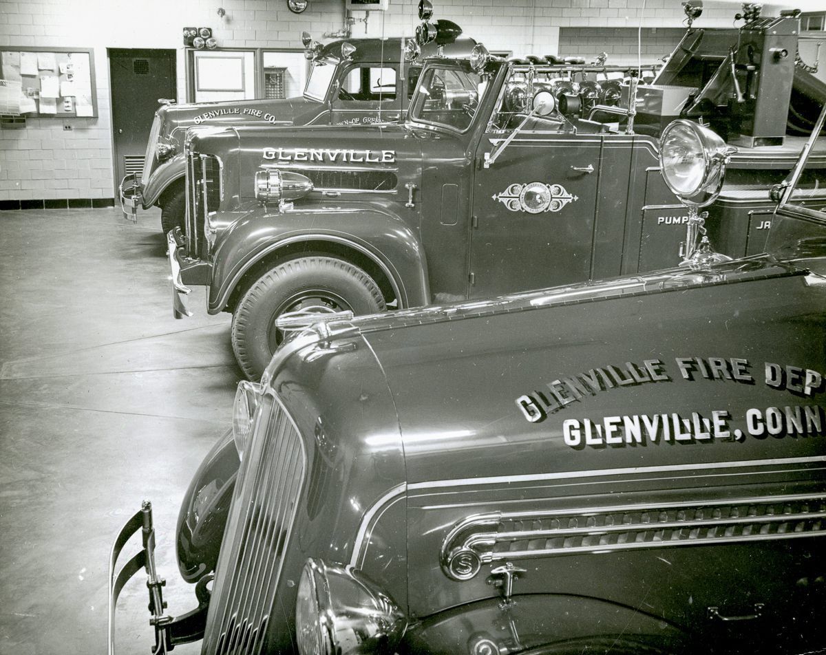 Fire engines in the garage of the Glenville Firehouse.Collection