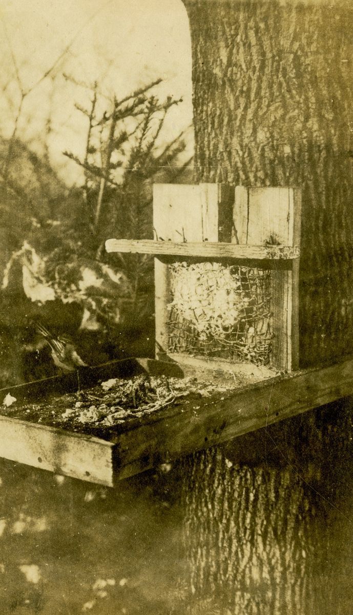 A picture of a chickadee on a feeder taken at about 4:00 PM in February, in the back of George Clark's house.