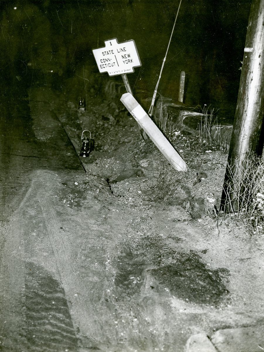 A partially knocked-down state line marker on the Post Road along with soil and gravel that has been washed down onto the road after the "Great New England Hurricane" of 1938.Collection