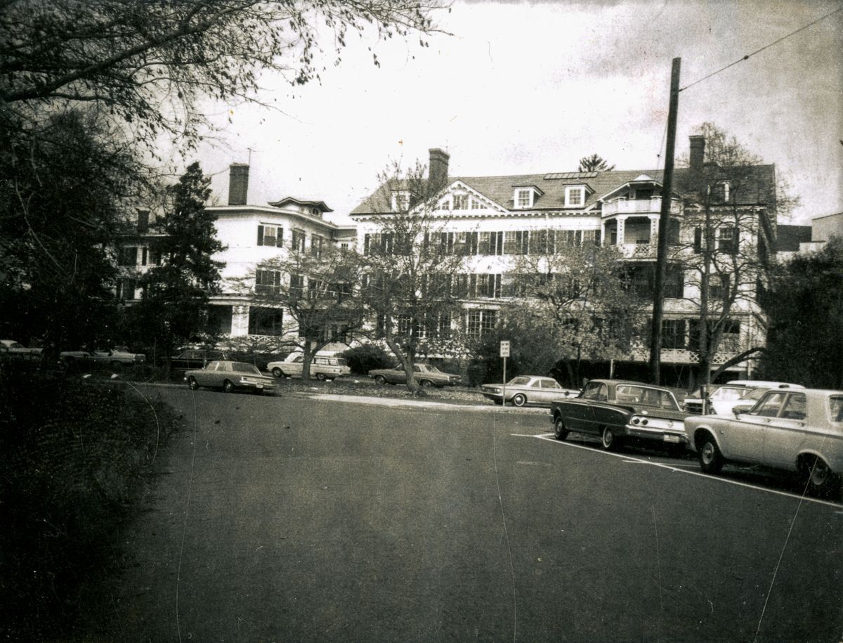 A view of the Maples Hotel on the corner of West Putnam Avenue and Benedict Place in Central Greenwich. Opened in 1899 as a hotel by Ms.'s Emma and Louise Willard after they leased the house that E.C. Benedict lived in, the hotel was eventually demolished in 1965 to make way for office buildings.Collection